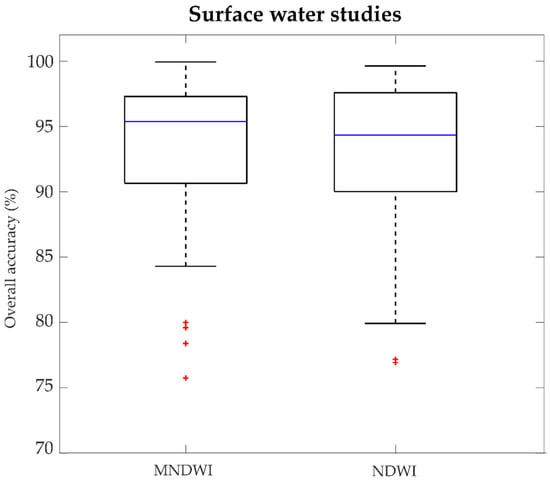 Regarding surface water detection, the MNDWI and NDWI were the most common indices (27.8% and 26.4% of use among open water studies, respectively), followed by the AWEInsh (15.3%), NDVI (11.1%), AWEIsh (9.7%), WRI (4.2%), NDMI, and MNDWI7 (5.6%). Figure 4 illustrates the performances of these indices expressed in terms of OA. In this case, the MNDWI had an OA median value of 95.37% (horizontal blue line in the figure) and a relatively small spread of the data. However, some outliers were observed. The NDWI and AWEInsh had similar performances to those of the MNDWI, in terms of median value (94.41% and 94.80%, respectively), data spreading, and outlier values. The NDMI showed the lowest median value among all selected spectral indices (median OA value of 88.80%). Although the highest OA median value was observed for the WRI, only five studies were available, which may not be sufficient to satisfactory interpret its performance.
