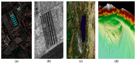 Example data widely-used in geoscience-related applications: (a) the composite HSI image of Pavia University, northern Italy, acquired by the ROSIS sensor, (b) SAR image from the Yellow River dataset, acquired in June 2008, (c) image of Lake Tahoe acquired by Landsat 8 operational land imager (OLI), (d) National Elevation Data map of Australia DEM.