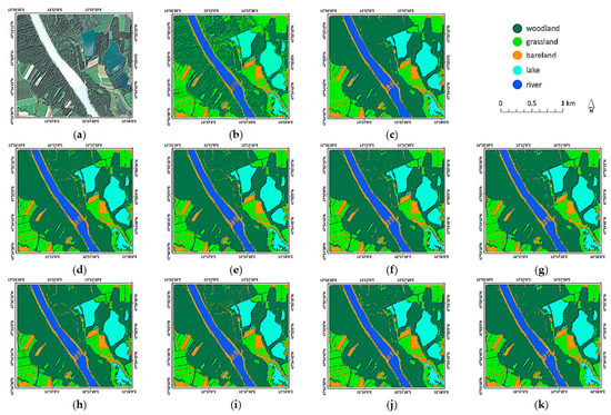 Land cover mapping results obtained by the methods described by Csillik [62] (a) original WorldView-2 RGB image, (b) pixel-based classification, (c) multiresolution segmentation classification, (d–g) SLIC superpixel classification for various superpixel sizes, and (h–k) SLICO superpixel classification for various superpixel sizes.