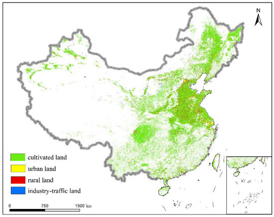 Land use data at a 1 km spatial resolution for 2000, 2010, and 2020 were obtained from the Resource and Environment Science and Data Center (https://www.resdc.cn/) (accessed on 20 April 2022). These images are mainly based on US Landsat TM images and Landsat 8 remote sensing images, and are generated through artificial visual interpretation. Land use and land cover data provide important information about parcels, including class, area, and spatial distribution [49], which involves four categories for human habitation: urban land, rural land, industrial transportation land, and arable land. Urban land refers to the built-up areas in large, medium, and small cities, counties, and towns. Rural land refers to rural settlements independent of towns. Industrial transportation land refers to the land used for factories and mines, large industrial areas, oil fields, salt fields, quarries, and other lands, as well as traffic roads, airports, and special land. Arable land is the area on which crops are grown.