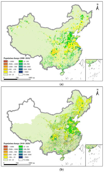 Based on the population distribution results with a 1 km spatial resolution, we calculated the population change results in China from 2000 to 2010 and from 2010 to 2020 with 1 km spatial resolution (Figure 8). This result showed that population growth mainly occurred in the Yangtze River Delta, Pearl River Delta and Beijing-Tianjin-Hebei regions. With the rapid development of China’s economy and the continuous advancement of urbanization, China’s overall population density has grown rapidly. In particular, highly developed cities such as Beijing, Shanghai, Guangzhou, Shenzhen, and Chongqing are attracting larger populations.
