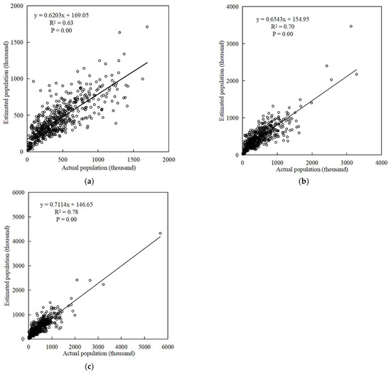 Scatter plots of census data and model simulation results of (a) 2000, (b) 2010, and (c) 2020.