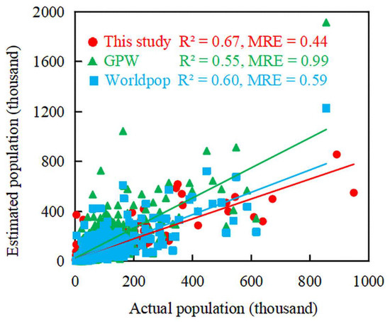 In addition, this study validated the accuracy of the simulated population spatialization results with townships/streets census data. Since the seventh census data at township/street level are not fully released at present, we use the census data of 750 townships/streets in Beijing, Shanghai, Guangzhou, Shenzhen, Anhui, Shaanxi, Gansu, Guizhou, Jilin, and Hubei to validate the accuracy of the spatialized results in 2020. We also compared with two population grid datasets (GPW and Worldpop) and the validation results are shown in Figure 10. The R2 for this study was 0.67, the mean relative error (MRE) was 0.44 and the p value was 0.00, while the R2 for the GPW dataset was 0.55 and the MRE was 0.99, and the R2 for the Worldpop dataset was 0.60 and the MRE was 0.59. The accuracy and mean relative error of the predicted values in this study are better than the results of GPW and Worldpop datasets. The simulated population spatial distribution results of this study are highly correlated with the census results.