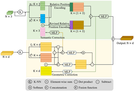 Given a point cloud with n points, their coordinates and acquired features can be denoted as and , respectively. As shown in Figure 2, we firstly perform k-nearest neighboring (kNN) to search K candidate neighborhoods denoted as and . Neighbors only based on Euclidean distance may bring in noisy points, so we affiliate with semantic information to revise the neighboring points. Then, the K neighbors and its center points construct a cluster to describe the local geometry. The elements of the cluster consist of four parts: point-wise distance-based neighbors , neighbors rectified with semantic information , the relative coordinates and distances . The cluster characteristics are fed into a shared MLP to generate feature map to represent the geometric information.