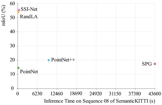 Inference time comparison on sequence 08 of SemanticKITTI and mIoU of SemanticKITTI of PointNet [17], PointNet++ [18], SPG [9], RandLA [10] and SSI-Net (ours).