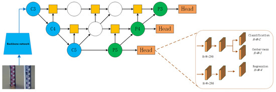 The water gauge detection network in this article is modified from the FCOS network. FCOS is an excellent one-stage network that has both detection speed and detection accuracy. FCOS is a pixel-by-pixel FCN-based object detection model. This network contains three parts of backbone, feature pyramid network, and heads, which are applied for classification and regression. The model is mainly deployed with the idea of edge computing [60,61]. Edge computing is a proposed solution to solve the hydrological monitoring of a river area. In an edge computing network, many facilities involving data processing and storage can be placed closer to the data source. In this way, the preprocessing of data can ensure the real-time requirements of the application, and the security of information can also be better protected. For edge deployment, the network needs to be as small as possible while ensuring accuracy. FCOS needs improvement to detect small objects. Based on FCOS, a convolutional network for water gauge detection was proposed with the basic network ResNet-54. FCOS uses five feature maps of different scales for further detection. Since the task is single-target detection, these feature maps of different scales are not necessary, so we kept just three feature maps in this module. The heads for regression and classification are also reduced to three. After adopting the above modifications, the complexity of the model and the monitoring accuracy are taken into account at the same time. The effect of multi-scale fusion was improved based on feature pyramids [62]. The information contained in the feature maps of different levels is different. The high-level features more easily give people an intuitive feeling and contain relatively macro information, while the lower levels hide more details. Level features and underlying level feature fusion are the core of the model [63,64,65]. For feature maps of different levels, minimization of the loss of the original semantic information in the fusion is the focus of research. A context fusion module is used to solve this problem. This module is dedicated to discovering correlations between contexts. Contextual adjustment produces dense pixel-level contextual information while improving the efficiency of feature encoding in long connection paths. The structure diagram of the improved FCOS model is shown in Figure 1. Yellow squares indicate the CA module: each CA has a high-level feature map input, a low-level feature map input, and outputs a feature map fused with contextual information.