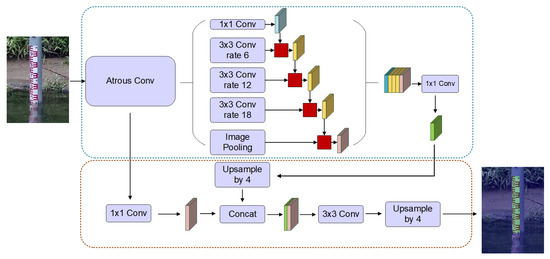 Semantic segmentation based on CNN has reached a very impressive level [66,67,68]. From FPN to DeepLab series models [59,69,70,71], the performance of semantic segmentation is continuously improving. DeepLabv3+ employs an atrous pyramid pooling and encoder–decoder architecture to encode multi-level contextual information by processing incoming features through void convolution with multiple expansion coefficients and sensory fields for pooling operations, while the decoder network can get more informative object edges by reverting to spatial information step-by-step. DeepLabv3+ achieves state-of-the-art results on the VOC2012 dataset. However, this model still has some limitations that lead to the inability to apply the model directly to the water gauge level recognition task. The model for water level recognition needs to be run on an edge device rather than a computer in the future, so there is a limit to the size of the model [72]. Thus, ResNet-54 is the backbone network for DeepLab [73]. The reduction to the backbone network leads to a reduction in performance. To alleviate this problem, taking into consideration the segment accuracy of whether the water gauge is under the water or not, the method of feature mixing was improved by employing the contextual fusion module, which is shown in Figure 2. As a comparison, the improved DeepLab is shown in Figure 3.