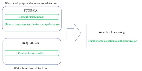 Here is a summary of our work to solve the problems above. First, the fully convolutional one-stage (FCOS) object detection model was employed [36]. To efficiently detect small objects with a smaller model, FCOS was improved by fusing the context fusion model to determine the area of the gauge and the numbers above the water surface. After getting these, the rough water level value can be determined. Then, the semantic segmentation model named DeepLabv3+ was applied to segment the water gauge above the water surface [37]. After that, the water level can be determined from the result of segmentation. The above-water part and the underwater part of the water level gauge have similar image features. River water with different levels of clarity will make the underwater gauge look different. However, the clearer the water is, the more the water gauge underwater looks the same as the water gauge above the water. This phenomenon causes the model to have difficultly distinguishing between the two parts of the water gauge. We find an innovative way to solve this problem by proposing a contextual semantic fusion module for the DeepLab model. The main contributions of this paper include the following: