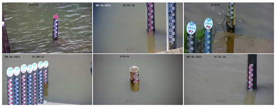 At present, there are no effective relevant datasets, so the source data of the dataset were obtained by contacting the Wuyuan City Hydrological Bureau. A total of 600 basic hydrological images were collected. The source data covers 20 sites, including different environments such as water pollution, low light, etc., to meet our complex environmental needs. In addition, some pictures in the dataset that were similar to the actual shooting are from the Internet. Data augmentation was performed on the source data for a richer dataset and included annotating dials and numerals with 12 classes. Finally, the images were processed to a size suitable for the model. There are two sizes: 5.6 kb, and 0.6 kb. Samples from the dataset are shown in Figure 6.