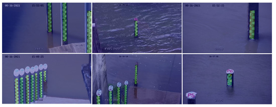 From the experiments at the actual monitoring points of the artificial campus lakes, it can be seen that the recognition accuracy of the model has excellent performance just with a tiny difference from the results of manual observation, and the absolute error is kept within 1 cm, which meets the requirements of the observation level standard. At the same time, this paper measured the recognition of the level of water gauges in seven special complex scenarios. The measurement results are shown in Table 6.
