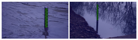 In this section, the self-made Water Gauge Dataset is used to train the improved DeepLabv3+ semantic segmentation model (represented as DeepLab-CA), and then its performance is tested. The FCN and Unet segmentation models are also selected as the comparison models. The test results of the models above are listed in Table 3. In the experimental results of water gauge region segmentation, the segmentation results are represented as light green regions and are superimposed on top of the original image while reducing the brightness of the original water gauge image to obtain more considerable visualization test results. The visualization segmentation results of DeepLab-CA on the actual water gauge image are shown in Figure 11.