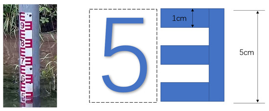 To verify the effectiveness of recognition in this model, the evaluation index used in this paper is the absolute difference value from the vertical height of the water level line observed by human eyes compared to that identified by the algorithm. The height here is the number on the gauge body. The schematic diagram of the water gauge reading is shown in Figure 14. The physical distance between each letter E and the flip E is 5 cm, and the physical width of each “cross” of the letter E is 1 cm. The center of each number corresponds to the position of a “cross” center in the middle of the letter E. There are 10 “crosses” between the centers of two adjacent numbers. The reading of the water level value in the chart is 5.0 or 50.0 cm, without units, which means the distance of the mark relative to the bottom of the gauge, and with units, which means the physical distance relative to the bottom of the gauge. The actual hydrological scenario of the water level value also needs to be calculated using the elevation information of the water gauge installation location, and only the relative marking distance of the gauge is used as the water level value for discussion in this paper. The water level value in the graph is 5.0.