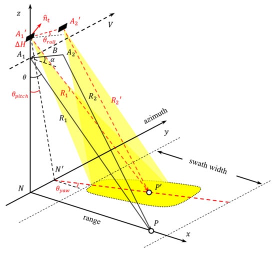 Figure 1 shows the IRA geometry: the solid line represents the geometry of the ideal scenario and the dashed line represents the geometry of the scenario with coupling attitude error, in which the antenna position, the radar beam pointing position, the baseline direction, and the baseline inclination are all changed by the coupling attitude error, and, finally, the entire observation swath direction is changed as well. The coupling attitude altimetric error can be calculated by the difference between two flat-earth phases, one from the observation scenario with coupling attitude error, and the other one from the ideal observation scenario. The effect of coupling attitude error combined with platform altitude, roll, pitch, and yaw errors can be described with a transformation matrix [23,32].