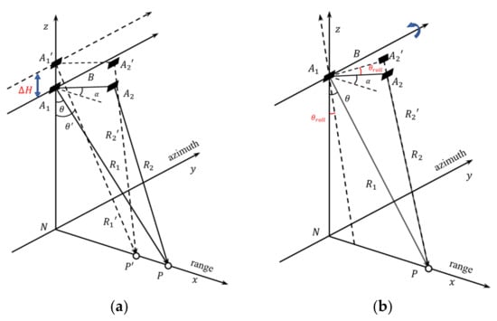 In the geometric model with platform altitude error plot in Figure 2a, the altitude changes from to due to the altitude error. Supposing the baseline angle and the slant-range between the target and the master antenna keep no change, the changed radar beam will point to the position of from ,