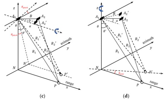 Supposing the pitching angle of platform is as shown in Figure 2c, which causes the rotation of the baseline vector around the x-axis and the translation of the swath from line to , the position can be written as in Equation (21),