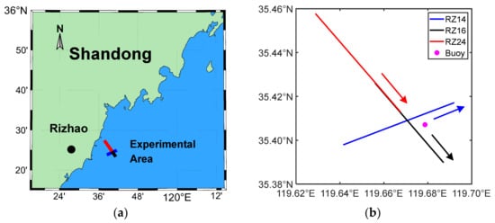 This paper will use three data sets of airborne IRA experiments which were acquired from the Rizhao sea area, China. The experimental area is shown in Figure 3a, and the three data sets named RZ14, RZ16, and RZ24 were retrieved on 14, 16, and 24 November 2019, respectively. Three flight tracks are marked in Figure 3b, and the flight tracks of data RZ14 (blue line) and data RZ16 (black line) cross around the buoy location (pink marker), and the flight tracks of data RZ16 (black line) and RZ24 (red line) are parallel.