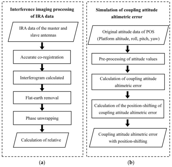 Flowchart. (a) Relative SSE imaging processing. (b) Coupling attitude altimetric error calculation.