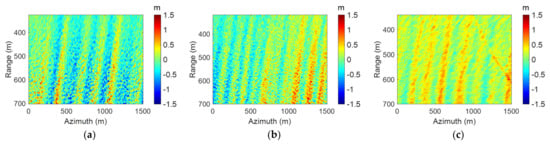 It can be seen that the features of the slant stripes in Figure 10 are consistent with those in Figure 6. To make a quantitative comparison, the profile curves of the altimetric error along the azimuth of the IRA images in Figure 10 are compared with the SSE retrieved from IRA images in Figure 6 at 3 different ranges (the nadir range at 50m, the middle range at 350 m, and the far range at 700 m). It should be clarified that in this comparison, the SSE retrieved from IRA images contain both geophysical signals and the altimetric errors. In order to show the high-frequency altimetric error more clearly, only the altimetric errors induced by the attitude angle errors are shown in Figure 11.