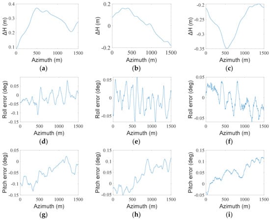 In order to reveal the physical mechanism of the slant stripes in Figure 6, the coupling attitude altimetric errors induced by the systematic attitude errors of the airborne IRA are evaluated based on the theoretical formulas proposed in Section 2. The systematic attitude errors recorded by the POS_AV610 are shown in Figure 7.
