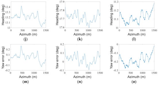 Here, it should be pointed out that the systematic attitude errors in Figure 7 have been smoothed with a spatial window whose size is equal to the synthetic aperture scale of the IRA. As shown in Figure 7, although the variations of the platform altitude errors are significant, compared with the attitude angle errors, the altitude errors change slowly. The attitude angle errors have rapid changes, which are high-frequency errors compared to the platform altitude error. There is a fixed aircraft heading angle for each data set. As shown in Table 1, the aircraft heading angles of data RZ14, RZ16, and RZ24 are 16 degrees, 15 degrees, and 17 degrees, respectively, and the yaw error is floating around the aircraft heading angle, so the yaw angle error is the result of the yaw angle minus the fixed aircraft heading angle.