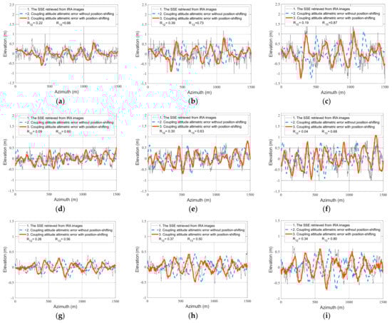 Profiles of the coupling attitude altimetric errors and the SSE retrieved from IRA images. is the correlation coefficient of the SSE retrieved from IRA images (the thin black solid curves) and coupling attitude altimetric errors without position-shifting (the blue dashed curves), and is the correlation coefficients of the SSE retrieved from IRA images and coupling attitude altimetric errors with position-shifting (the thick red solid curves). (a–c) are the profiles retrieved from RZ14 at the nadir range, middle range, and far range, respectively. (d–f) are the profiles retrieved from RZ16 at the nadir range, middle range, and far range, respectively. (g–i) are the profiles retrieved from RZ24 at the nadir range, middle range, and far range, respectively.