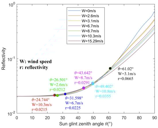 The wind speed of 8.7 m/s and the sun-glint zenith angle of 43.642° at 16:00 on 17 June 2019 were input to the model to obtain the sea-surface reflectivity of 0.0291 at that time [51]. In addition, the parameters of different sea areas in Section 5.4.2 were input to the model, and the corresponding sea-surface reflectance was obtained; the reflectance is marked with dots of different colors in Figure 2.