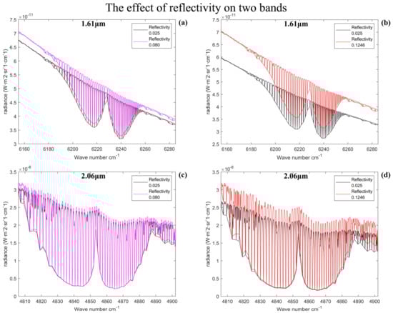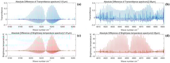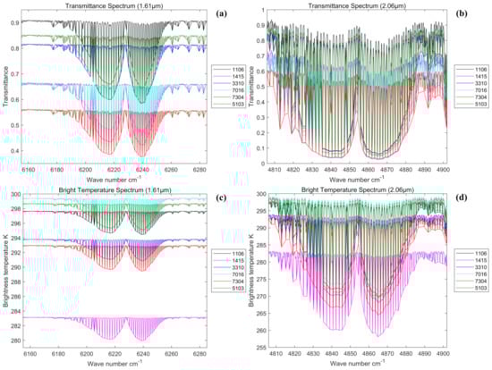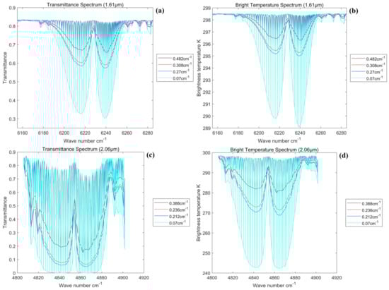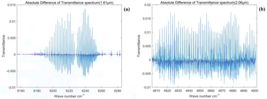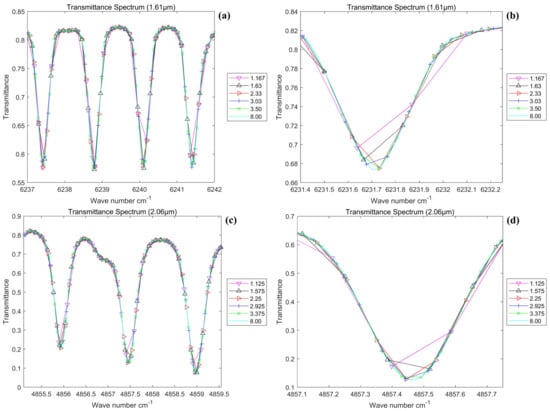 In the simulation calculations performed in this subsection, considering that the actual spectral width of the instrument is limited by the optical spectroscopic system, the actual design index of GAS is substituted into the model as follows: the 1.61 μm spectral band with a spectral width of 30 nm and a spectral resolution of 0.27 cm−1 and the 2.06 μm spectral band with a spectral width of 40 nm and a spectral resolution of 0.212 cm−1. Moreover, in this paper, the detector is abstracted as an array of image elements in the simulations, and the difference in the actual performance of the detector is not considered. The actual performance difference and the effect of the spatial dimension are thus not considered. Only the comparative transmittance spectra are simulated in this subsection.