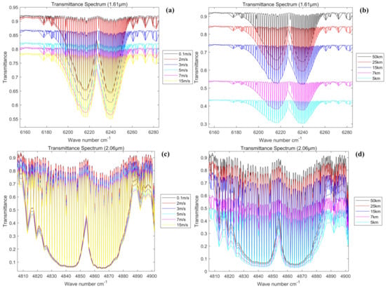 Comparison of simulated spectra at different wind speeds and visibility levels. (a) Comparison of transmittance spectra with different wind speeds in the 1.61 μm spectral band; (b) comparison of transmittance spectra at different visibilities in the 1.61 μm spectral band; (c) comparison of transmittance spectra with different wind speeds in the 2.06 μm spectral band; and (d) comparison of transmittance spectra at different visibilities in the 2.06 μm spectral band.