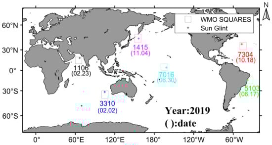 Here, the FY-3D satellite orbital parameters are imported into Systems Tool Kit (STK) software to generate the real-time position of the sun glint and the solar zenith angle at different times. The selected time period spanned from 15:42 to 16:20 on 17 June 2019, when the GAS sun-glint position shifted from north of Antarctica in the Southwest Atlantic to the sea west of Canada in the Northwest Atlantic. The position and angle information of the sun glint at each moment are shown in Table 1. The variation pattern of sun-glint zenith angle during the day and the distribution of sun-glint positions on the map are shown in Figure A4.