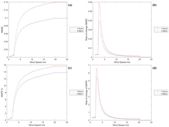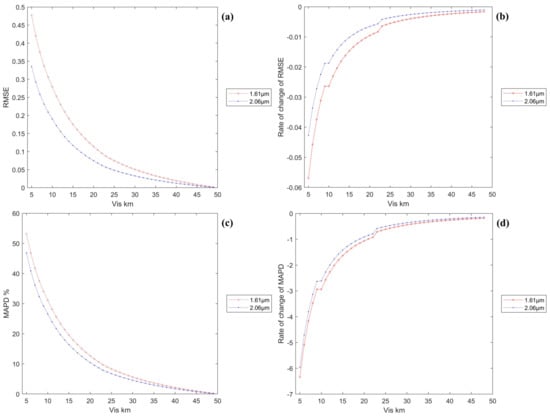 Figure 5b,d illustrates that the transmittance spectra of both spectral bands decrease with decreasing visibility. According to the aerosol absorption principle, the visibility is inversely proportional to the aerosol attenuation coefficient [53], corresponding to a decrease in radiant energy with a decrease in visibility; this finding is consistent with the simulation results. Similar to the wind speed simulation results, when the visibility decreases, the decrease in the 1.61 μm spectrum is more obvious than that in the 2.06 μm spectrum.