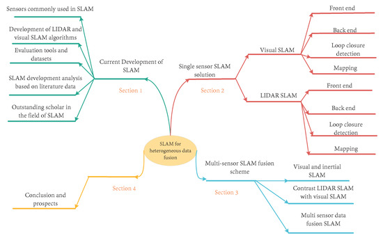 187] used LIDAR information to assist in visual pose optimization, and the overall framework was based on ORB-SLAM2. First, the visual part obtains the precise environmental information from the LIDAR sensor, and then this information is transformed into a visual tracking thread posture to optimize the initial value. The system can be adapted to the change in weight of two types of sensor fusion, where the system has high accuracy for the reference keyframes and motion model; however, in the process of generating a trajectory, the accuracy may fluctuate. Since then, some researchers have tried to use point and line features [