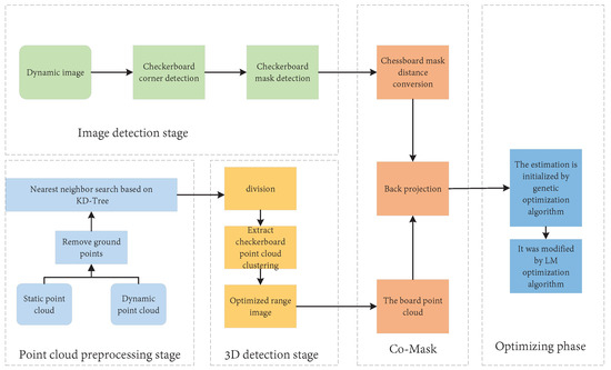 142] proposed a fully automatic end-to-end method based on the 3D–2D joint correspondence mask (CoMask), which can directly estimate the extrinsic parameters with high accuracy. The genetic algorithm was combined with the Levenberg–Marquardt method, which can solve the global optimization problem without any initial estimation. The general framework of the study is presented in
