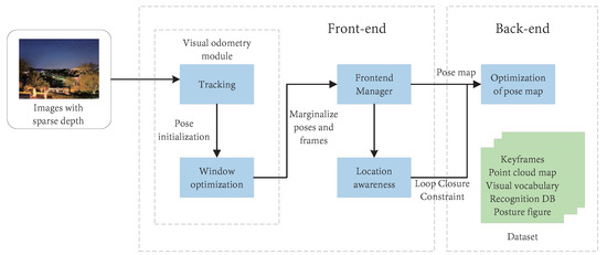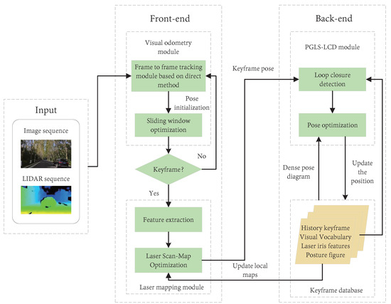 151] proposed a direct visual–LIDAR fusion SLAM framework, which includes a frame-by-frame tracking module, an improved sliding window-based refinement module, and a parallel global and local search loop closure detection (PGLS-LCD) module, and combines the bag-of-visual-words (BoW) and LIDAR iris features for location recognition. Finally, a high-precision real-world trajectory and point cloud maps can be generated. The framework diagram for generating high-precision point cloud maps using direct methods is presented in