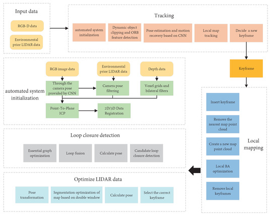 Figure 24, a detailed flowchart of the CNN-based fusion method is presented. The flowchart is mainly composed of five parts: the first part is the environmental information and LIDAR data collection; the second part is the process of tracking for precise automatic initialization of the RGB-D SLAM algorithm, to extract all the keyframes; the third part is the elimination of redundant keyframes; the fourth part uses the ICP algorithm to determine the camera pose and select the correct keyframe; and the fifth part performs loop closure detection.