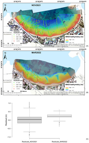 Absolute residual values over bathymetry map for: (A) November 2021 bathymetry inversion; (B) March 2022 bathymetry inversion; (C) Box-plots of residual values for each date. The black horizontal line inside each box indicates the median value of each sample and the whiskers extend from the 1st to the 3rd quartile.
