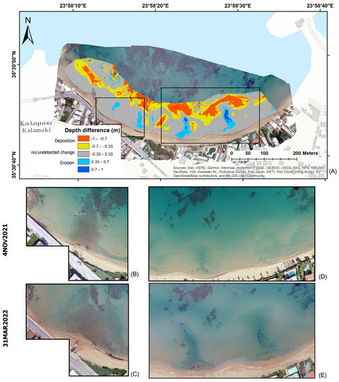 (A) Bathymetric difference map (November-2021 minus March-2022); (B,C) True-color orthomosaic subsets showing the temporal changes within the left polygon area; (D,E) True-color orthomosaic subsets showing the temporal changes within the right rectangle area.