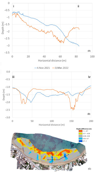 Temporal bathymetric profiles: (A) across-shore (i–ii); and (B) along-shore (iii–iv); (C) Legend map showing the profiles on the bathymetry difference map.