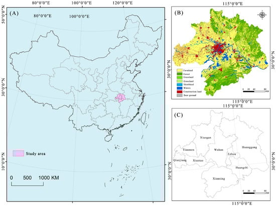 As shown in Figure 1, the Wuhan Urban Agglomeration (Central China) refers to the area around Wuhan with a radius of approximately 100 km. The total area of Wuhan, Huangshi, Ezhou, Xiaogan, Huanggang, Xianning, Xiantao, Tianmen, and Qianjiang is 579 × 104 hm2, accounting for 31.09% of the total area of Hubei Province. In 2021, the total resident population of the region exceeded 33 million, and the GDP exceeded 3 trillion. The Wuhan Urban Agglomeration is located at latitudes 29°02′~31°51′N and longitudes 112°33′~116°07′E. It belongs to the midlatitude zone. Solar radiation varies seasonally, and the area is far from the ocean. It has a typical subtropical East Asian continental climate, with four clear seasons and substantial amounts of light, heat, and rain.