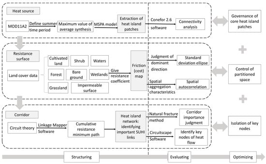 Some scholars have explored mitigation strategies for the UHI effect from the perspective of constructing spatial networks. For example, Yu et al. (2021) identified the critical nodes in a UHI network and then broke the network to effectively mitigate SUHI []. To reflect the contributory nature of the article in examining the overall logic of the TSPurban, in this research, as shown in Figure 2, we propose a TSPurban based on the new paradigm of “heat source–resistance surface–corridor” and alleviate the UHI effect by blocking connectivity. Finally, we creatively develop the research framework of the TSPurban’s “construction–evaluation–optimization” logic system.