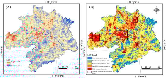 Due to the difference in time and environment, the surface temperatures cannot be directly compared. However, the distribution of the relative intensity of the thermal field is not affected by other factors, so to analyze the relative spatiotemporal changes in the surface thermal environment, the urban surface thermal field is classified based on the surface temperature [].
