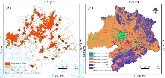 Previous studies have fully demonstrated the ability of land cover elements (such as forest, water, and grassland) to reduce temperature [,]. The resistance scores of different land use types in the heat island diffusion pathway are determined, and the larger the resistance scores are, the greater the heat island blocking force, patch migration, and diffusion.