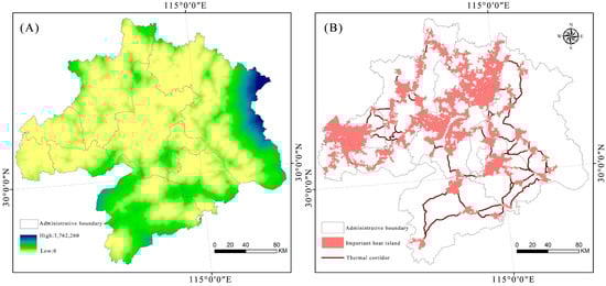 Distribution of minimum cumulative resistance (A) and the thermal corridor (B).