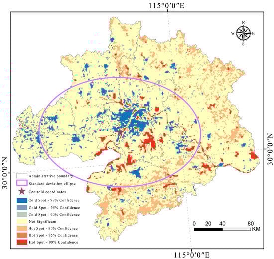 The standard deviation ellipse can measure the concentration, dispersion, and direct distribution of geographical elements, explore the distribution and development trend of geographical elements, and visualize the spatial pattern of geographical elements. Lefever first proposed this method in 1926, and it is widely used in many fields and studies, such as population, economy, and sociology [,]. Based on the analysis of the standard deviation ellipse of the heat island friction (cost) map for the Wuhan urban agglomeration, the direction and trend of the heat island resistance patch in the study area are reflected. Among them, the shape of the ellipse can, to some extent, reflect the characteristics of the geographical element distribution. It mainly includes the directional angle, center, ellipse X and Y axes, and standard deviation. The formulas are as follows: