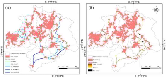 At the same time, heat island patch spreading resistance is mainly distributed in mountains, woodlands, and water areas where human activity is minimized, such as river basins. Because of their intrinsic resistance to heat island patch spreading, the resistance value of these localities is higher. Finally, the resistance values of these regions form the characteristic spatial pattern of “middle low, four sides high”. Figure 7A shows that the corridors spatially connect the otherwise independent heat sources. Due to the limitations of geographical space and friction cost along corridors, the connection lengths between them are not the same. The total length of the corridor centerline is 1004.71 km. In the Wuhan Urban Agglomeration, a network of heat sources has grown, making it easier for each heat source to connect to other heat sources and strengthening the urban heat island as a whole.
