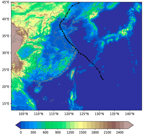 The Advanced Research WRF (ARW) [40,41] Version 4.2 is employed in our current study. Figure 2 shows the simulation domain with the center located at (31°N, 123°E) and the best track of Typhoon Ampil. The horizontal grid size is 559 × 469, and the grid resolution is 9 km. Vertically, there are 57 layers with the model top at 10 hPa. The 0.25° × 0.25° Global Forecast System (GFS) reanalysis data are used to provide the initial and boundary conditions. Some parameterizations used in this study include the Thompson microphysics scheme [42], the Yonsei University (YSU) boundary layer scheme [43], the Goddard short wave radiation scheme [44], the Rapid Radiative Transfer Model (RRTM) longwave radiation scheme [45], the Noah Land surface model, and the Grell–Freitas cumulus parameterization scheme [46].