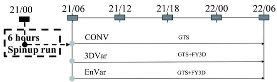 Before the assimilation, quality control of radiance data is vital. Referring to the previous studies of Fengyun polar-orbit satellites and some common satellite quality control methods [25], the final used quality control schemes are as follows: (1) Eliminate the observations with brightness temperature less than 50 K or greater than 550 K; (2) reject observations with residual (difference between observation and simulated background brightness temperature) exceeding 15 K; (3) for the observation whose residual error is greater than 3σ0 after bias correction. σ0 is the standard deviation of the observation; (4) discard those complex observations over land and ocean, which are marked by the WRF model topographic files. In the practice of assimilation, due to the complexity of cloud and precipitation, only regions not contaminated by clouds in satellite fields of view are used, which is called the clear-sky strategy. The systematic bias of radiance is estimated by combining several predictors with their coefficients, including the constant 1000–300 hPa, and 200–50 hPa layer thicknesses, surface skin temperature, total column precipitable vapor, and the satellite zenith angle as the predictors. The variational bias correction scheme (VarBC) [31] is applied by adding the predictor coefficients in the control variables.