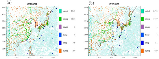 Distribution of GTS observations at (a) 0600 UTC on 21 July 2018, (b) 0600 UTC on 22 July 2018. SATOB (satellite atmospheric motion vector), Airep (aircraft data), SOUND (radiosondes).