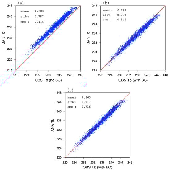 The scatter plots of channel 5 observed versus simulated brightness temperature (unit: K) of background (a) before the bias correction, (b) after the bias correction, and (c) observed versus simulated brightness temperature of the analysis.