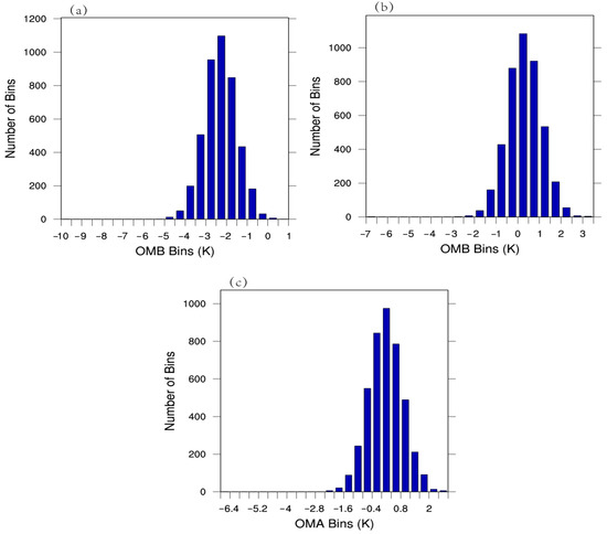 The frequency distribution histogram of (a) OMB without bias correction, (b) OMB with bias correction, and (c) OMA with bias correction of channel 5.