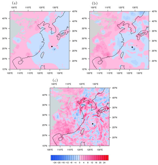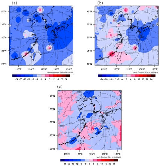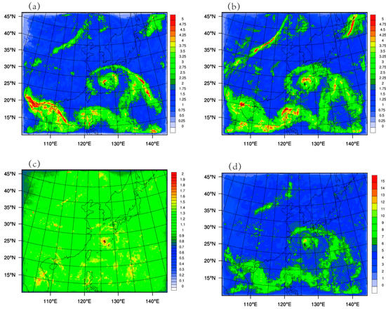Figure 1 shows the typhoon circulation by National Centers for Environmental Prediction (NCEP) Final (FNL) Operational Global Analysis data [34]. The generation and development of many destructive tropical cyclones are closely related to the large-scale environment of subtropical anticyclones [35,36,37]. Sufficient moisture flux was observed in the east of Taiwan to Ampil’s inner core area, and the subtropical anticyclone was largely affected when the intensity of Ampil increased. With the increasing typhoon, the subtropical high extended westward and moved southward. Forced by the subtropical anticyclone, Ampil tended to move along the periphery of it. Satellite radiance data information can provide monitoring of a large area of the Earth. Compared to conventional observations, the high temporal and spatial resolution of the radiance data facilitates more precise initial conditions for the numeric weather forecast model [38,39]. Thus, an accurate initial condition of the circulation is essential to improve the forecast of Ampil by assimilating FY-3D MWHS-2 radiance data.